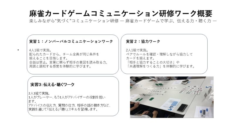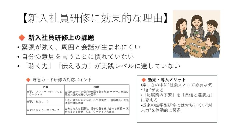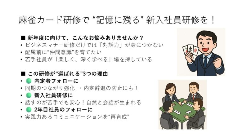 • ■内容:本資料をベースに、麻雀カード研修の狙いや流れ・活用ポイントをオンラインでご説明します。導入前の“まずは知りたい”という企業様向けの説明会です。