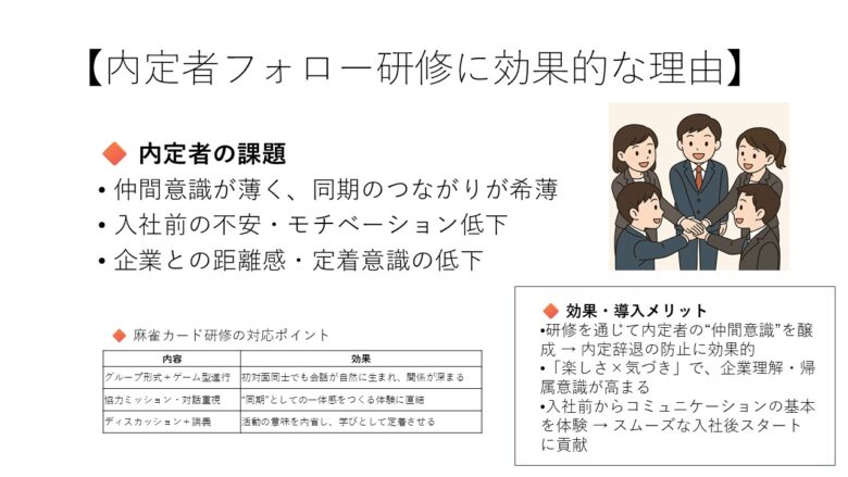 • 内定者向けフォロー研修(内定辞退防止の懇親会などに活用で最近特に問合せあり)